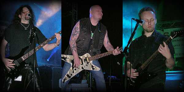 ![]() Die Freilichtbühne "Kahle Wart", wo sonst nur Volkstänze und plattdeutsche Theaterstücke zu sehen sind, verwandelte sich an diesem Freitag in ein kleines, aber feines Festivalgelände. Die Location, die nahe Bielefeld im Wiehengebirge gelegen ist, bot den Anwesenden Bands und Headbangern einen kleinen idyllischen Ort oben im Wald. Hintergrund des ganzen Spektakels, an dem 13 Bands teilnahmen, ist laut Veranstalter Michael Boyny (www.devils-warehouse.de) ein Protest gegen die massiv zunehmende Abmahnkultur in Deutschland. Selber von dieser Abmahnwelle betroffen, entstand erst die Idee, ein Konzert, später dann ein Benefiz-Festival zu veranstalten. Daran teilgenommen haben sowohl lokale als auch bekanntere Bands wie Rough Silk, Mourning Caress, Dark Age oder Endstille. ![]() Der Nachmittag stand ganz im Zeichen der heimischen Bands. So gab es Metal in verschiedenen Spielarten u.a. von SAMARA (www.myspace.com/samarametal), HOW SAD A FATE (www.myspace.com/howsadafate), HUMAN PARANOID (www.myspace.com/humanparanoid), BLOOD SPENCER (www.myspace.com/bloodspencer) oder UNCOVER (www.myspace.com/uncovermetal). Den besten und lautesten Gig sollen am Nachmittag die Bielefelder Death/ Thrasher von LOST WORLD ORDER (www.myspace.com/lwothrash) hingelegt haben. ![]() Der frühe Abend begann mit den thüringer Pagan/Folk Metallern GERNOTSHAGEN, die mit ihrer melodischen und atmosphärischen Musik eine Mischung aus folkigen Lagerfeuermitsingliedern und Saufgelage erzeugten. Die Songs kamen im Publikum sogar auch bei Leuten an, die mit dieser Musik bislang nicht so sehr konfrontiert wurden. So erntete die Band entsprechenden Applaus und zog die Leute vor der Bühne in den Bann. www.myspace.com/gernotshagenmusik ![]() Als nächstes standen die Münsteraner MOURING CARESS auf der Bühne und sie, voran Sänger Gerrit, taten alles, um das Publikum in Schwung und die Haare zum Wehen zu bringen. Im Mittelpunkt des Gigs standen vor allem Songs vom neuen, zweiten Album "Inner Exile", aber auch vom Erstling spielten sie meine damaligen Lieblingsstücke "Creating a hell" und "I Follow the Rain". Damals 2002 eher im Melodic Death kann man sie heute im Modern Metal einordnen. Der Gig war echt gut, Gerrit ein klasse Motivator der doch eher zurückhaltenden ostwestfälischen Fans. Nur als er sich als Preußen Münster Fan outete, gabe es von einigen (Arminen Fans?) im Publikum Pfiffe :-) www.myspace.com/mourningcaress ![]() Die Newcomer 2008 im melodischen Metal heißen bislang ORDEN OGAN. Sie kommen aus dem Sauerland und werden nicht zu unrecht stilistisch mit Blind Guardian vergleichen. Die Band zeigte sich spielfreudig und auch redselig zwischen den Stücken, zu denen in erster Linie Songs ihres neuen Albums "Vale" zählten, von dem u.a. "The Lord of the flies" als Schlusstrack den Leuten zu Ohren kam, die diese Musik dankbar aufsogen. Am meisten Stimmung erzeugte die Band naturgemäß bei den gespielten Coverstücken von Manowar ("Kings of Metal") und Running Wild ("Riding the storm"), die ja nahezu jeder kannte. www.myspace.com/ordenogan ![]() Dann spielte eine Band, die ich bislang nicht kannte, die mich aber mit ihrer Musik und ihrem gesamten sympatischen Auftreten voll überzeugt haben. ROUGH SILK aus dem Raum Hannover spielten geradlinigen Metal, der mitriss. Vor allem Sänger und Gitarrist Ferdy Doernberg zog einen in seinen Bann und hatte am Ende "sein" Publikum voll im Griff. Während bei Stücken wie z.B. "Mephisto" voll abgebangt wurde und Ferdy dann und wann auch mal ein Keyboard bedienen musste, gab es am Ende den alten Track "Never say never", bei dem letztendlich jeder im Publikum dazu animiert wurde, den Refrain mitzugröhlen. www.myspace.com/roughsilkmusic ![]() Die Hamburger Metal Combo DARK AGE war mein persönlicher Headliner an diesem Abend. Auch wenn es schon nach Mitternacht war, war die Stimmung sehr gut, sowohl auf der Bühne als auch im Publikum (siehe Fotos am Ende des Berichtes). Natürlich stand auch hier wieder das aktuellste Album, "Minus Exitus", im Mittelpunkt des Gigs, aber man vergaß auch alte Stücke wie den Hit "Zero" oder "The Silent Republic" nicht. Vom neuen Album kamen der Titeltrack oder auch "inside the outside" gut rüber. Ein echt guter Auftritt zu später Stunde, ganz nach meinem Geschmack. www.myspace.com/darkage404 ![]() Als Headliner gebucht waren die deutschen Black Metaller ENDSTILLE, die aber den Nachteil der Verzögerungen an diesem Abend zu spüren bekamen, denn als ihr Gig kurz nach halb zwei Uhr nachts anfing, leerte sich das Festivalgelände doch nach und nach. Zudem setzte im Verlauf Regen ein, der sich den ganzen Tag über schön zurückgehalten hatte. Ich muss zugeben, dass ich auch nur den ersten Teil des Gigs der Black Metaller gesehen habe, der von traditionellem Black Metal sowohl in musikalischer als auch bei der Performance (Sänger Iblis war in Kunstblut getränkt) dominiert wurde. Über die Musik lässt sich streiten, da ist die Gemeinde auch recht zwiegespalten. Die einen mögen diesen deutschen Black Metal sehr, die anderen Schwarzmetallfreunde gar nicht und der traditionelle Metaller machte sich über all das lustig ("Sportfreunde Endstiller"). An diesem habe ich zumindest nicht mehr dieses Black Metal Brett gebraucht, obwohl die Mucke der Norddeutschen sicher nicht die schlechteste in diesem Metal Subgenre ist. www.myspace.com/endstilleband Die Verlierer des Abends waren dann GEIST (www.myspace.com/geistmetal), die als lokale Black Metal Band noch nach ENDSTILLE auf die Bühne sollten, da war es dann schon fast wieder früh zumindest von der Uhrzeit her. Am Ende bleibt trotz der Verzögerungen im Billing aber ein positiver Eindruck dieses kleinen Festivalabends in Erinnerung. Coole Location, gute Bands, günstiges Essen und Getränke, dazu viele nette und friedlich feiernde (Metal-)Leute. Nur ein paar mehr hätten es noch sein können, damit der Ostwestfale in der Menge seine Zurückhaltung etwas mehr aufgibt. Vielleicht wiederholt sic